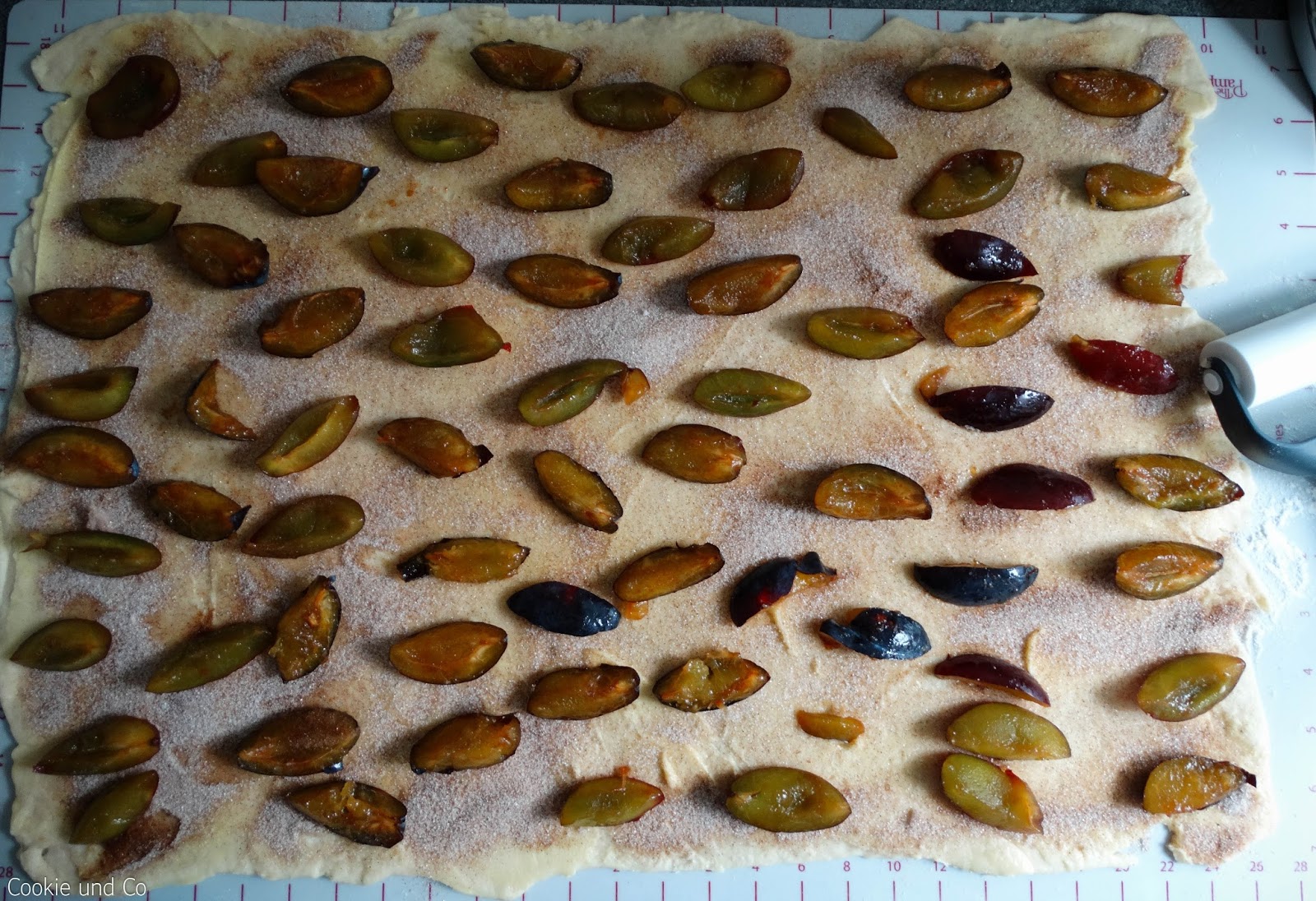 - Die Zwetschgen darauf verteilen (am besten quer zur Aufrollrichtung).